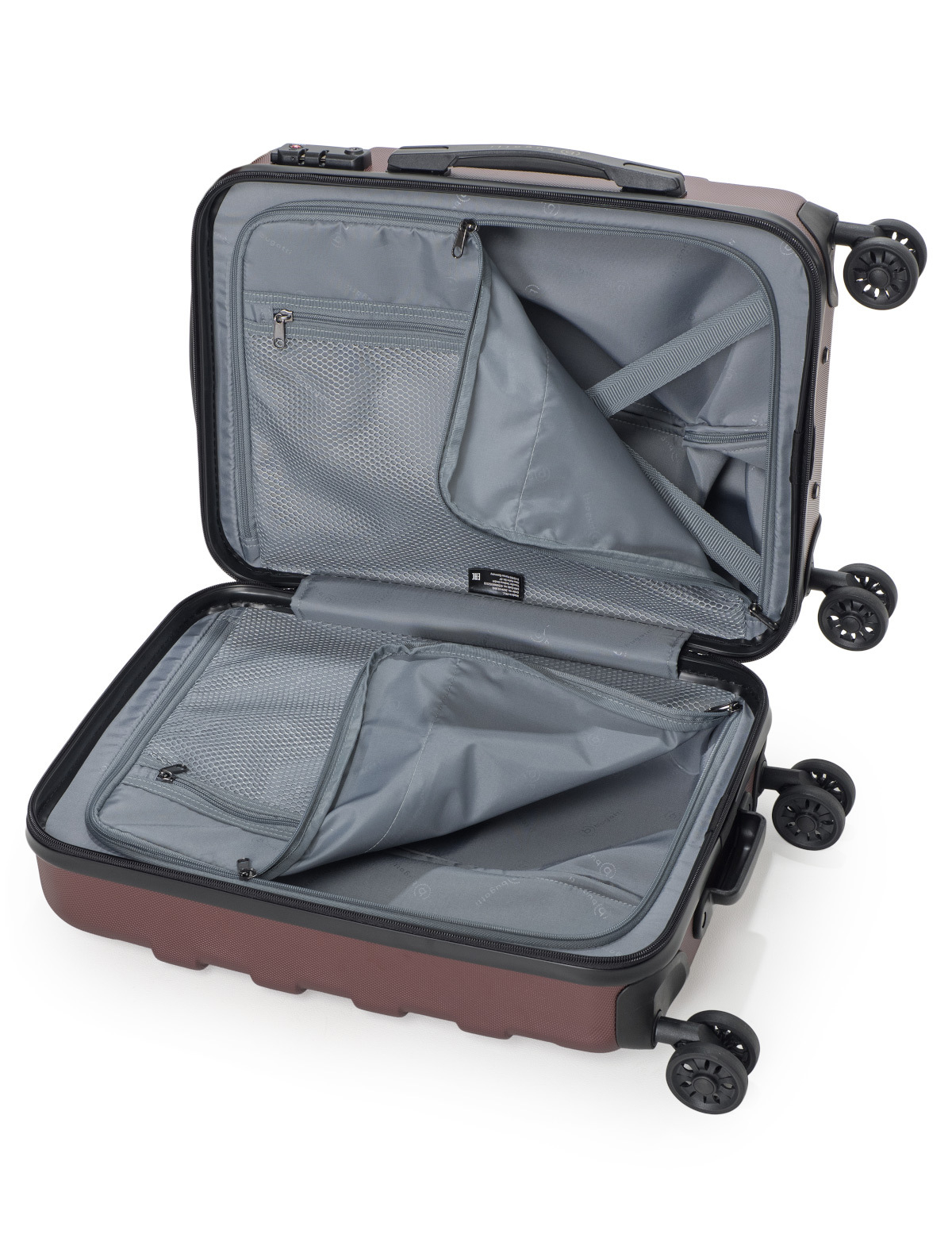 Внешняя организация: телескопическая ручка, кодовый замок TSA, 4 двойных колеса, боковая ручка, ручка на дне