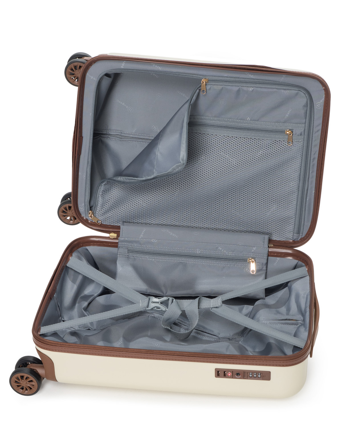 Внешняя организация: телескопическая ручка, интегрированный кодовый замок TSA, 4 двойных колеса, боковая ручка, боковые держатели.