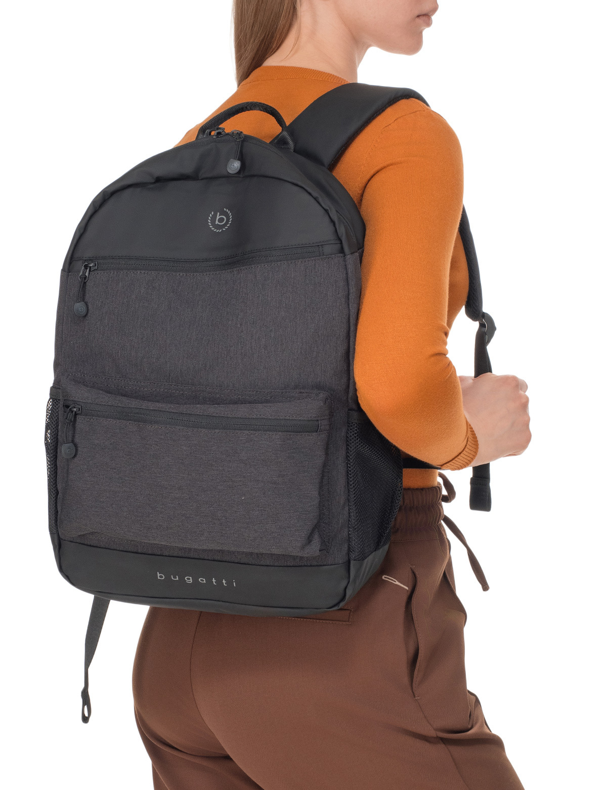 Внешняя организация: 2 передних кармана на молнии, 2 боковых сетчатых кармана для бутылки с водой, ручка высотой 6 см, 2 регулируемых плечевых ремня, рукав для соединения с телескопической ручкой чемодана