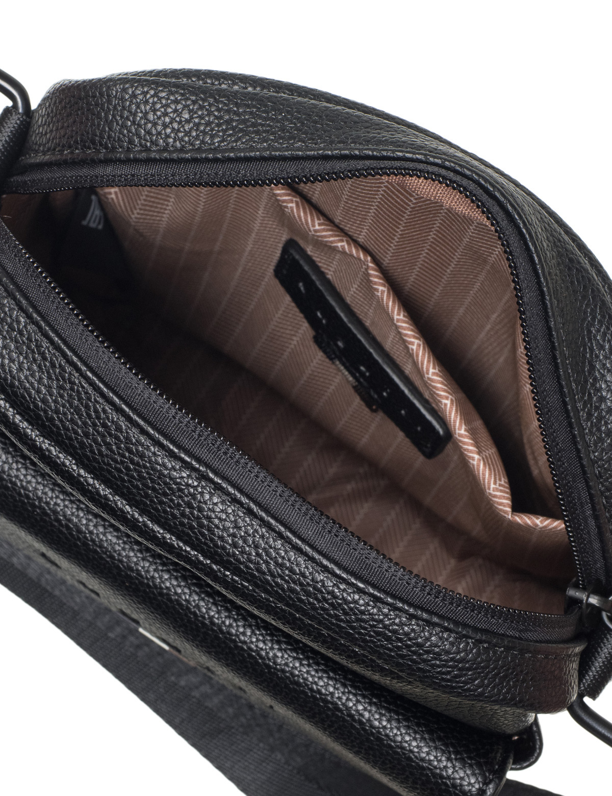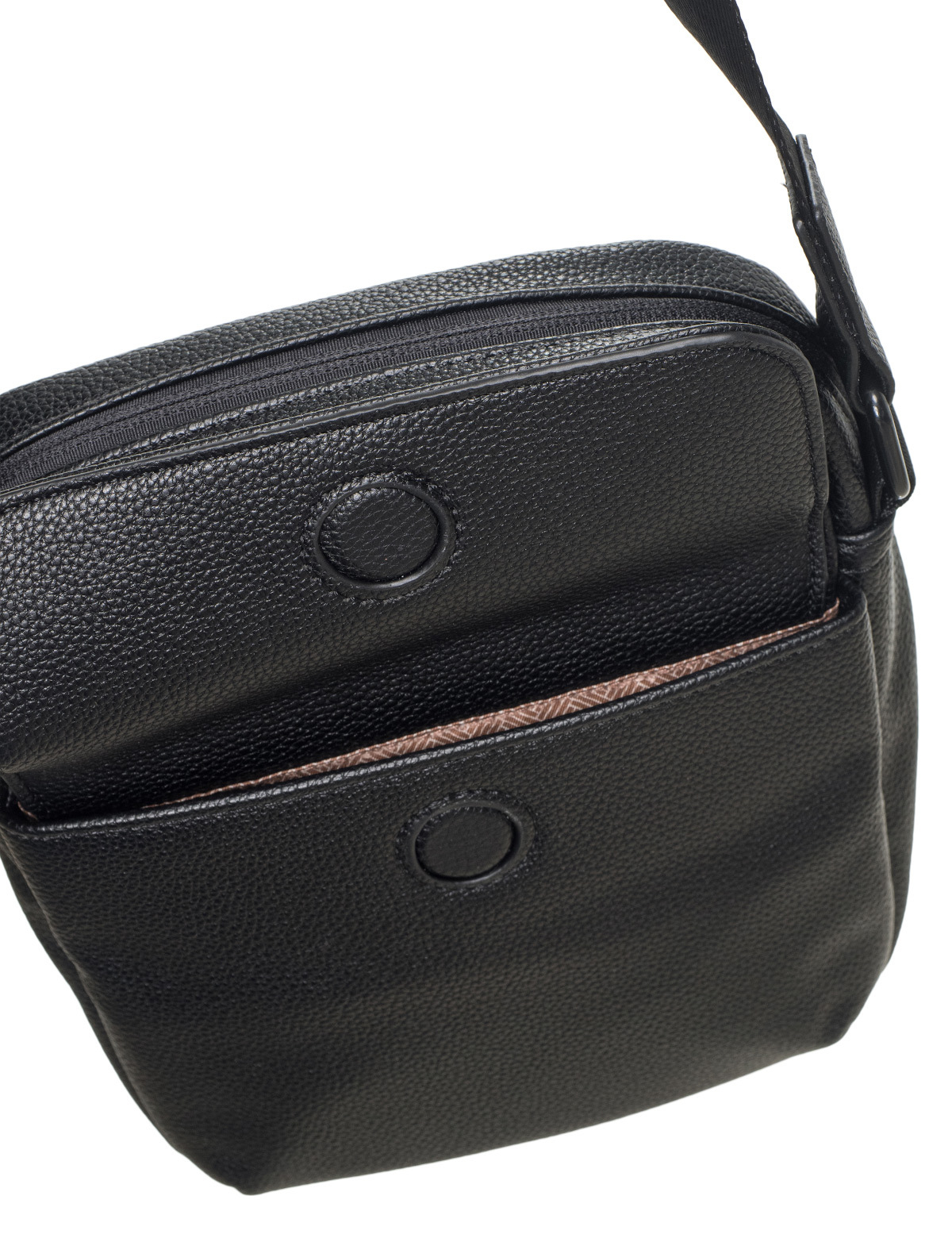 Функциональная организация: основное отделение на молнии с открытым карманом, задний карман на молнии, передний карман на кнопке, регулируемый плечевой ремень (высотой до 73 см).