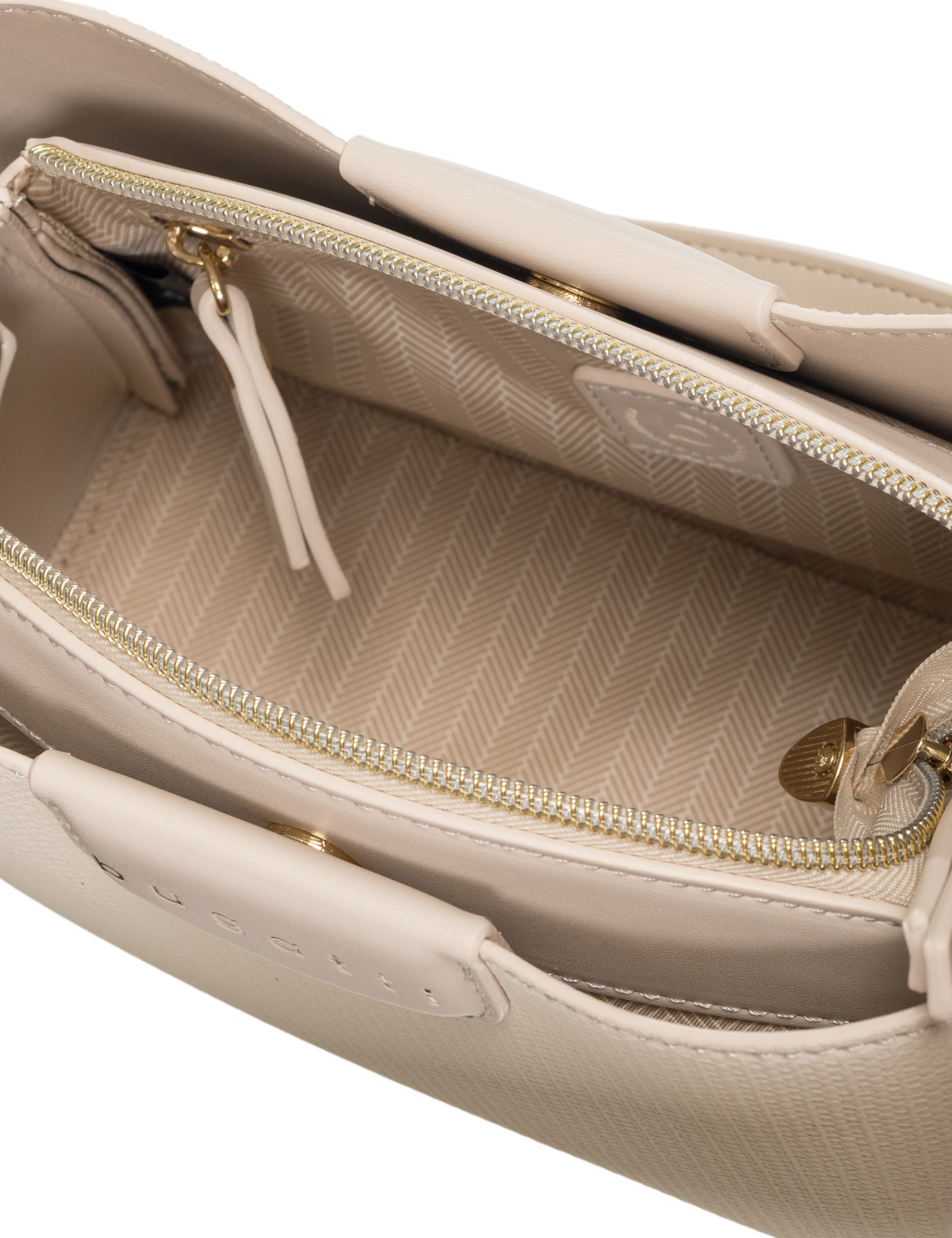Универсальная и стильная: благодаря короткой ручке с круглыми люверсами сумку можно элегантно носить в руке, а регулируемый плечевой ремень превращает ее в повседневную модель через плечо. Цвета коллекции – черный, бежевый и оливковый - идеально сочетаются с светло-золотистой фурнитурой и рельефным тиснением логотипа bugatti.