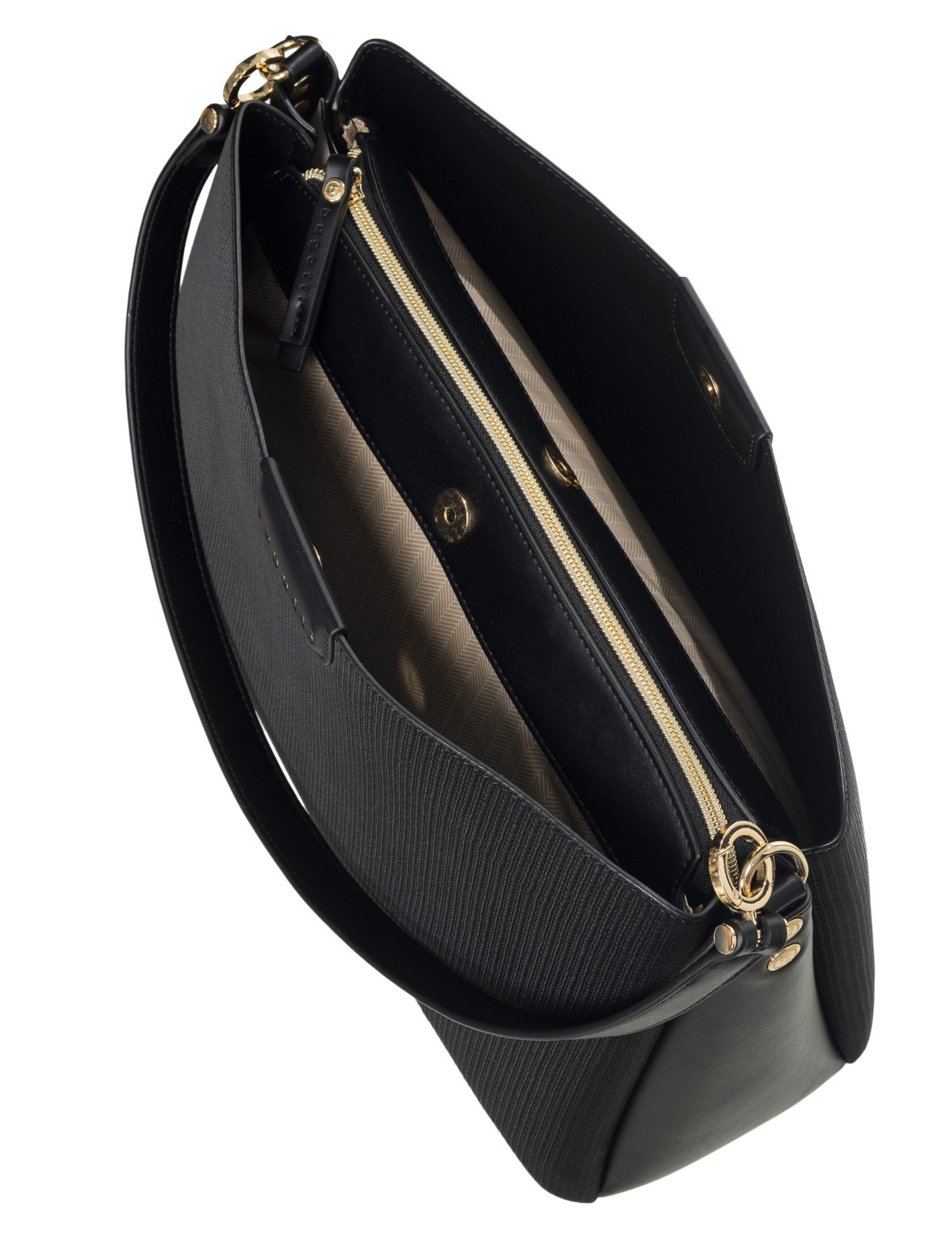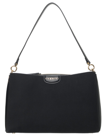 Универсальная и стильная: благодаря короткой ручке с круглыми люверсами сумку можно элегантно носить в руке, а регулируемый плечевой ремень превращает ее в повседневную модель через плечо. Цвета коллекции – черный, бежевый и оливковый - идеально сочетаются с светло-золотистой фурнитурой и рельефным тиснением логотипа bugatti.