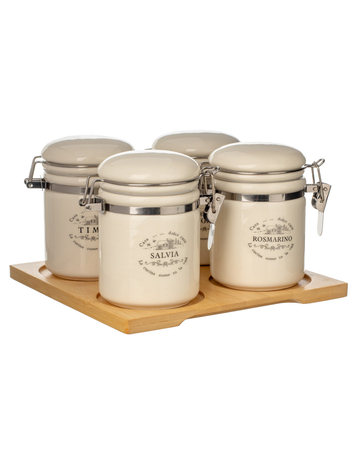 ХарактеристикиКомплектация: Баночка для специй с крышкой и замком - H10 см 4, Подставка - Длина 18 см Ширина 18 см 1, Фирменная упаковка: Коробка - Высота 21 см Ширина 19 см Глубина 9 см